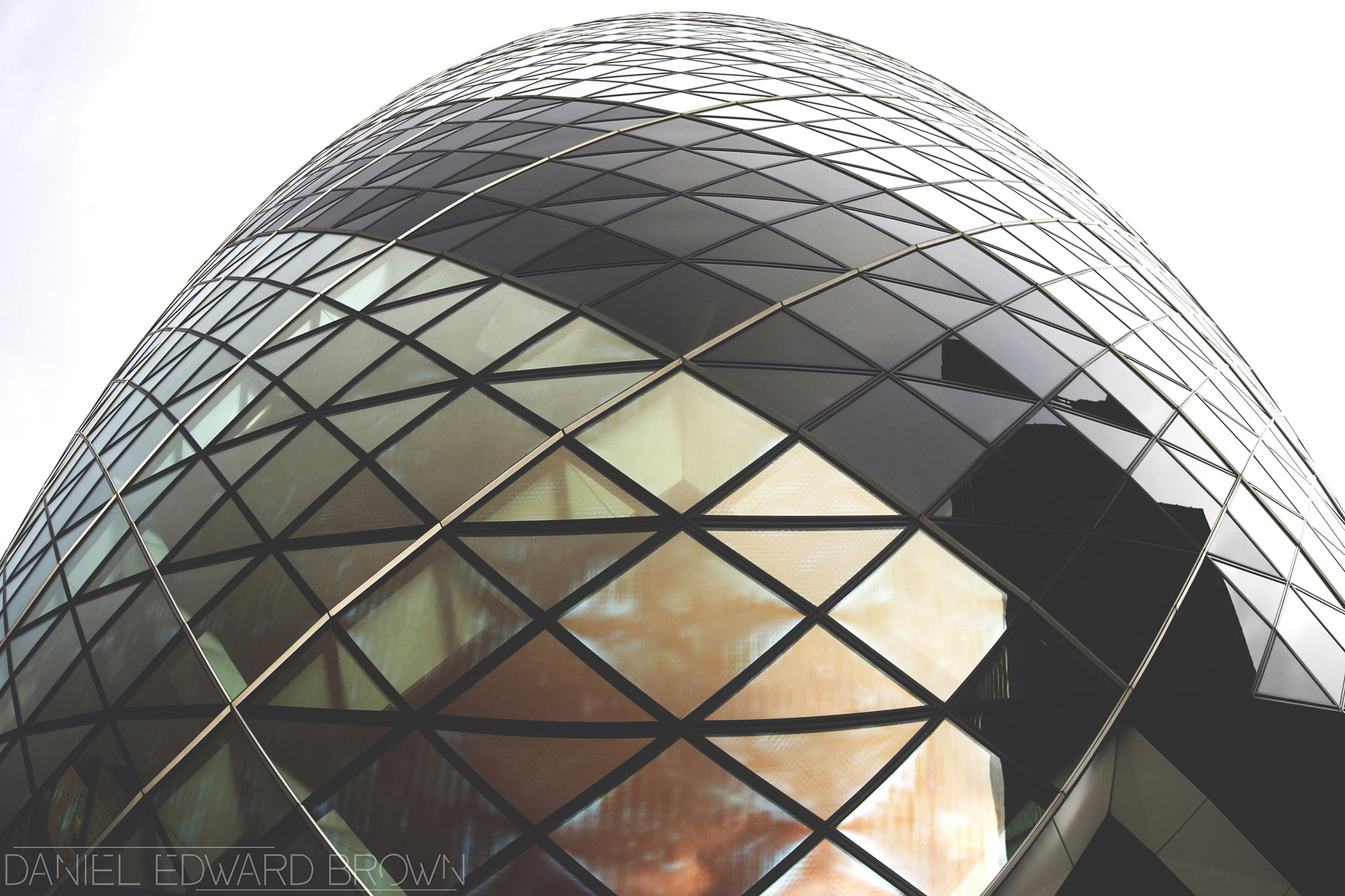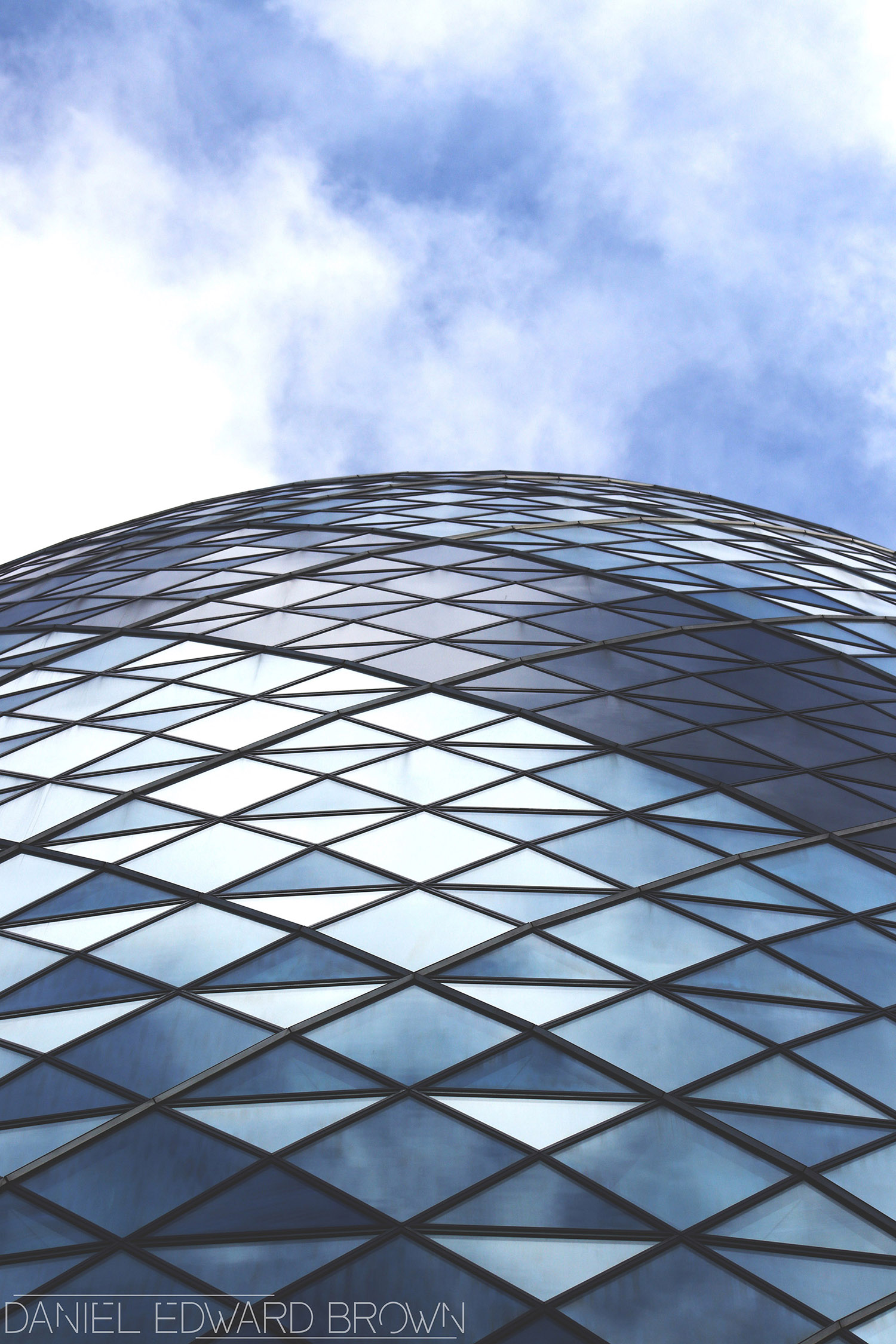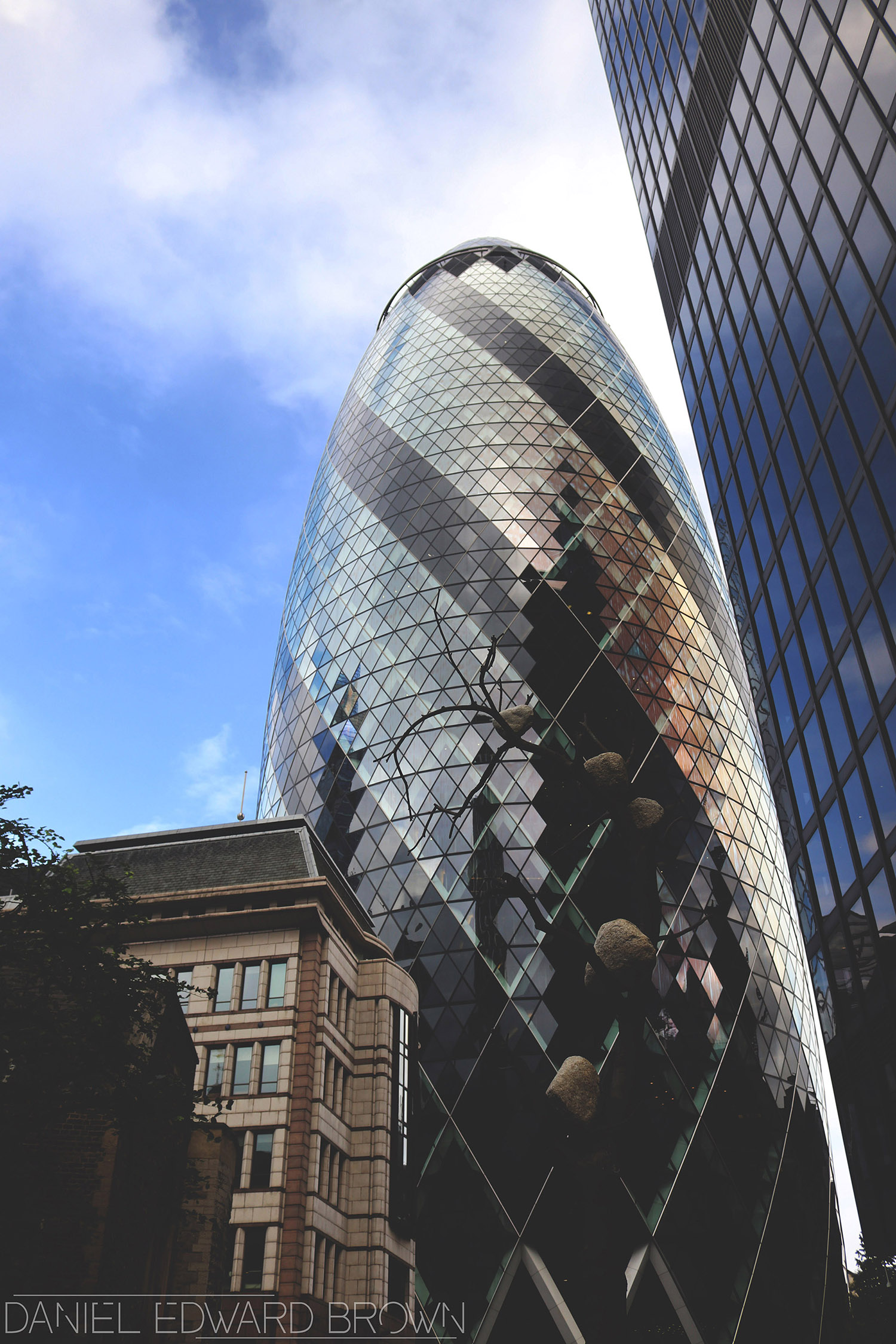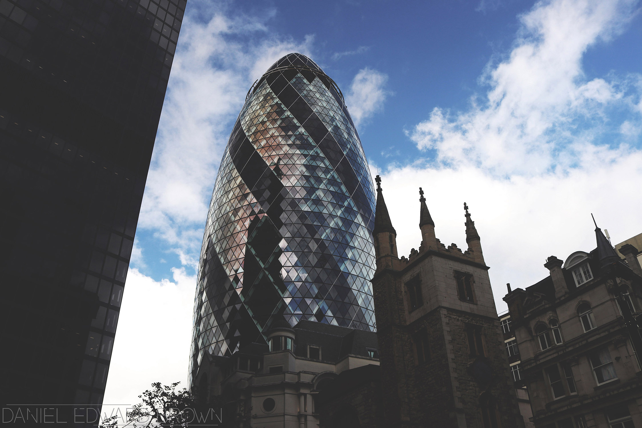 J ust like the other day when I went out to photograph The Shard, when I went out to The Gherkin the weather was pretty ideal for pointing the camera up towards the sky. The broken clouds kept from having a featureless blue background and there was some really grey looking clouds around which made things a bit more interesting.